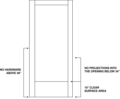 If there are any projections on the face of the door, they must be no lower than 34 inches above the floor or ground and must not extend more than 4 inches from the surface of the door. (Figure 3)
