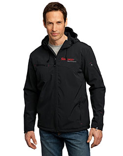 Port Authority® - Textured Hooded Soft Shell Jacket in Black with Simpson® logo on left chest in Red & White thread. Highly breathable and soft, this water resistant jacket is just right for the workday or the weekend. A hood and zippered sleeve vents add function and up-to-the-minute appeal.