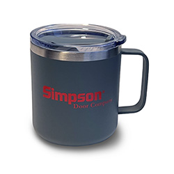 12 oz double wall 18/8 stainless steel thermal mug with copper vacuum insulation, stainless steel rim, clear push-on lid with matching swivel closure, and powder coated finish. In Matte Gray – Simpson Door Company Logo in Red.