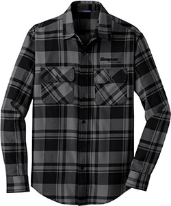Port Authority® Plaid Flannel Shirt in Grey/Black with Simpson® logo on Left Chest in Black Thread. 4.4 ounce 60/40 cotton/poly flannel.
