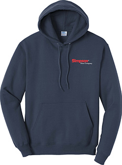 Navy Hooded Sweatshirt – 7.8-ounce 50/50 cotton/poly fleece. Air Jet Yarn, pill-resistant hooded sweatshirt in Navy with Simpson Door Company Logo on Left Chest.