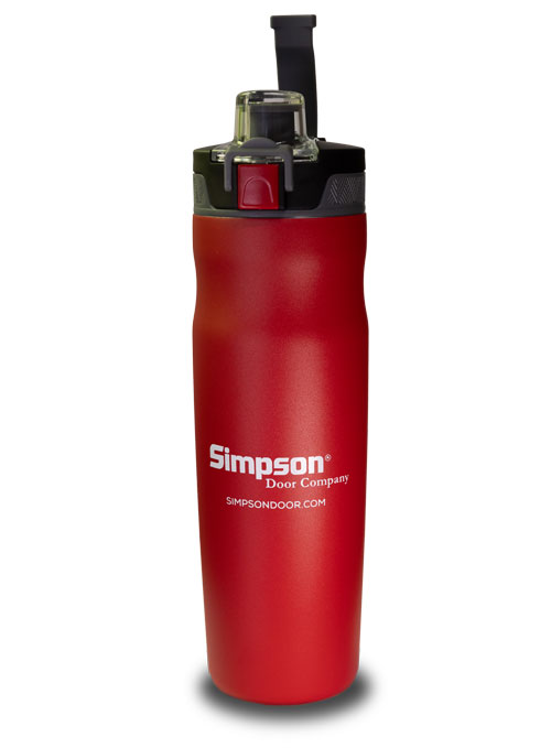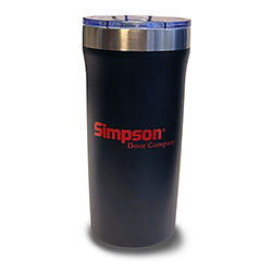 18 oz double wall 18/8 stainless steel thermal tumbler with vacuum insulation, brushed stainless steel rim, clear push-on acrylic lid with sliding closure, and powder coated finish. In Matte Black – Simpson Door Company Logo in Red.