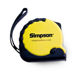 Measure which includes rubber coating, stop button, lock button, and belt clip with Simpson logo.